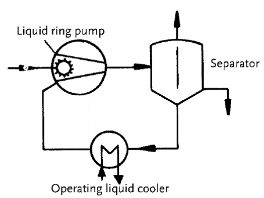 在化工和一般工藝過程中,液環真空泵的工作液不僅僅是水,還有可能是其他的液體,這就要求液環泵的工作液為一個閉式回路,圖中所示是一套較簡單的閉式液環系統: